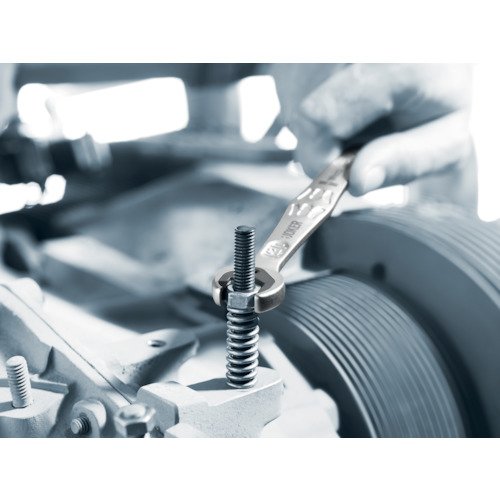 ●スパナでボルトをはさんだまま横向きで狭い箇所に挿入したり、上から力を入れて押さえながら、強いトルクでボルトを回すことができます。