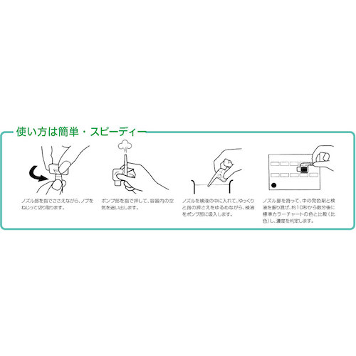 ●検水を吸い込み、色を比較するだけですので、特に専門的な経験や知識を必要としません。