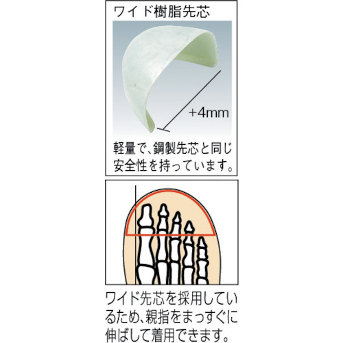 ●親指をまっすぐに伸ばして、快適に着用できるワイド樹脂先芯を使用しています。