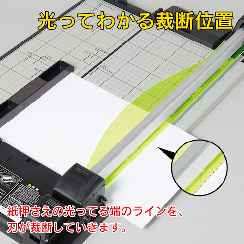 ●紙押さえ板に集光素材を採用し、裁断位置が把握しやすい50枚裁断機です。