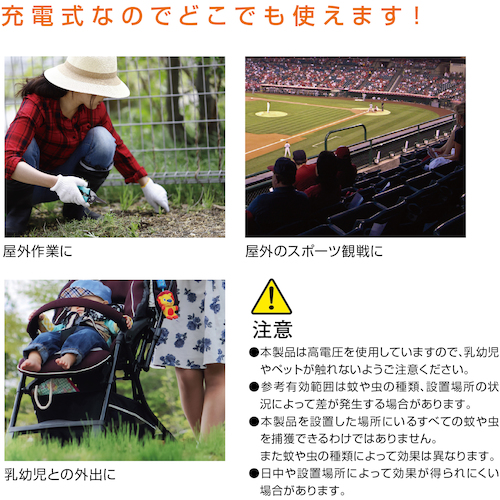 ●内部の電撃格子に触れると高電圧でいやな蚊や虫を駆除します。