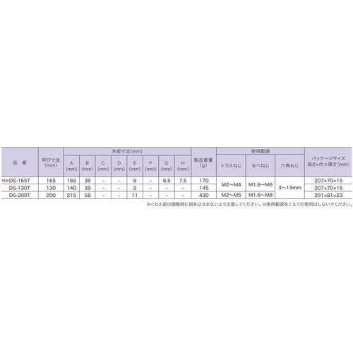 ●適合ねじ:M2~M5(トラスねじ)、M1.6~M8(なべねじ)、3~13mm(六角ねじ)