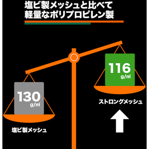 ●塩ビ2類メッシュに比べ約15%軽量で、約3年の耐候性能を持った建築足場養生メッシュです。