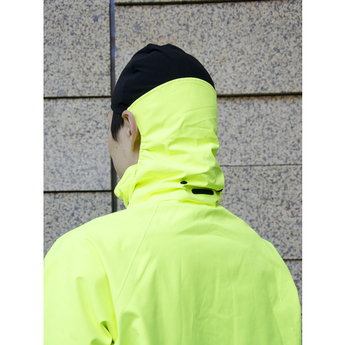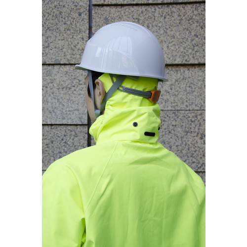 ●メットインフードでヘルメット装着時でも首元からの雨の進入を防ぎ、視界と音も妨げないため安全に作業が可能です。