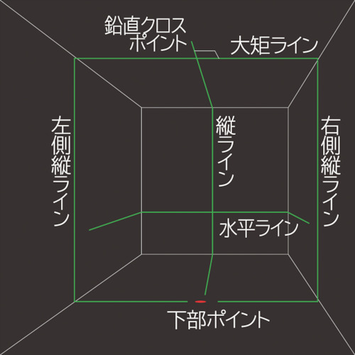 ●照射ライン:縦ライン(正面、右、左)、水平ライン、大矩ライン、ポイント(鉛直クロス、下部)