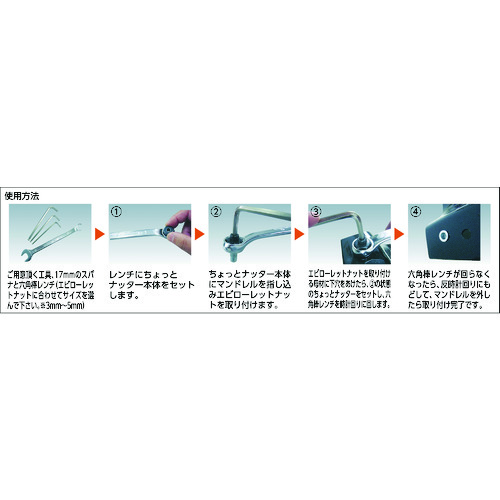 ●セット内容:M4用ナッター本体1個、六角穴付マンドレル(対辺3mm)1個、スチール製ナット(NSD4MR)10個