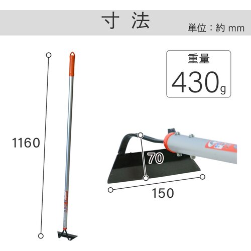 ●アルミ柄なので、木柄やスチールパイプに比べ水や汚れに強く、軽量です。