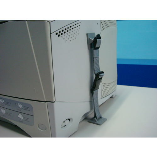 ●ベルトの両端に接続された接着パッド付フックの一方を卓上に、もう一方を卓プリンターの側面に接着固定して使用します。