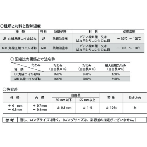 東発 丸線コイルバネ LRタイプ 外径 22 内径14.7 高さ 100 たわみ 32 荷重 474.6 LR22X100