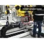 ●搬送台座の4カ所のリニアガイドへの給脂もM型自動給油装置と分配弁の組合せで1台で自動給脂することができます。パルサールブM型は電源不要なので稼動箇所にも設置可能で、高い吐出圧力で高粘度のリニアガイド専用グリスでも正確に供給できます。