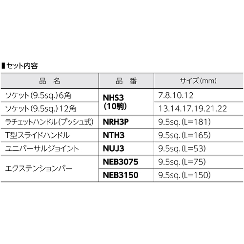 ●ソケット:6角7、8、10、12mm、12角13、14、17、19、21、22mm●ラチェットハンドル(NRH3P)●T形スライドハンドル(NTH3)●ユニバーサルジョイント(NUJ3)●エクステンションバー(NEB3075:75mm、NEB3150:150mm)
