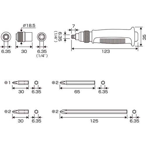 ●対辺6.35mm六角軸、片頭ビット対応です。
