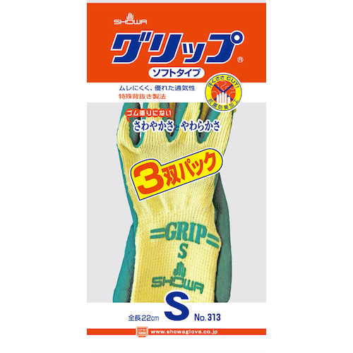 SHOWA 天然ゴム背抜き手袋 NO313グリップ(ソフトタイプ) 3双入り グリーン Sサイズ NO313-SGN