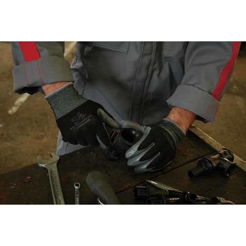 ●ホコリの出にくい長繊維で編んだ手袋に、耐油・耐薬品性に優れたニトリルゴムをコーティングしています。