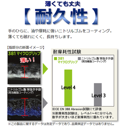 ●従来の発泡ニトリルゴムコーティングの背抜き手袋に比べて、耐摩耗性に優れています。