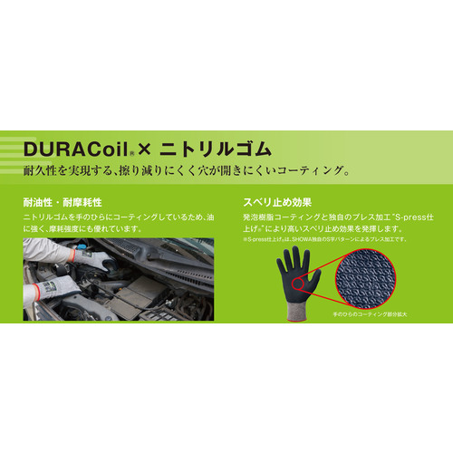 ●独自の繊維技術「デュラコイルテクノロジー」により耐切創性と作業性、肌触りのよさを両立しています。
