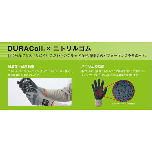 ●独自の繊維技術「デュラコイルテクノロジー」により耐切創性と作業性、肌触りのよさを両立しています。