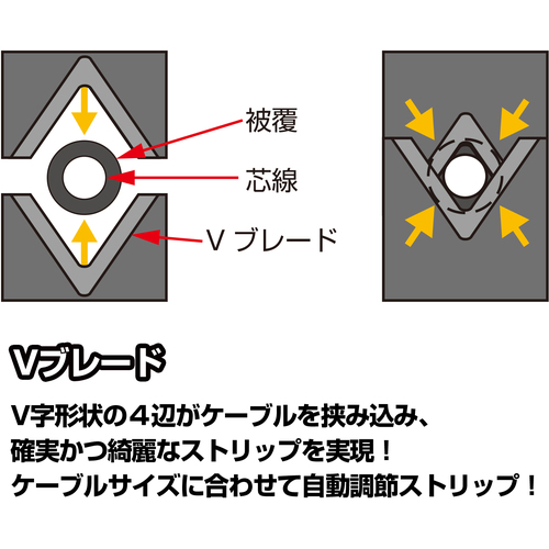 ●V字形状の刃がケーブルを挟み込み、確実かつ綺麗にストリップできます。