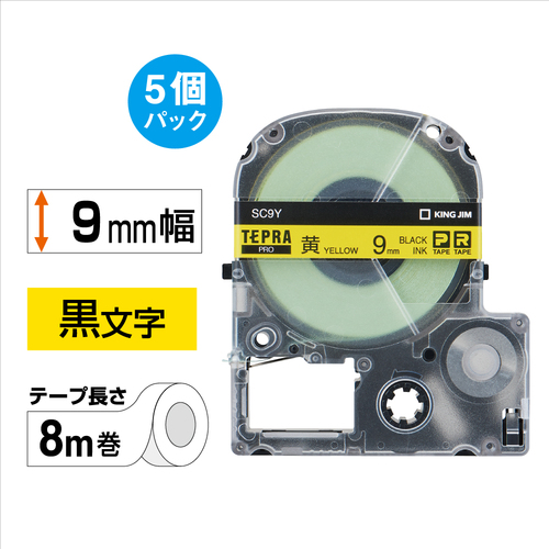 9. KING JIM 【純正】「テプラ」PROテープ 9mm エコパック(5個入り)/黄ラベル/黒文字 長さ8m SC9Y-5P