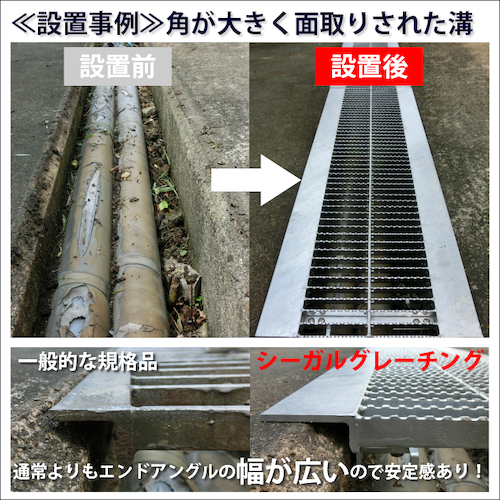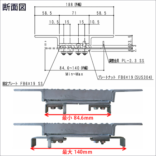 ●従来の規格品よりも幅の広いエンドアングルとアジャスター付きで内幅が調整可能なので、幅があいまいな溝にも設置可能です。