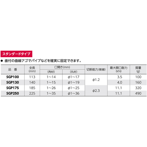 スーパー グリッププライヤ スタンダードタイプ 全長:113mm 口開き:(角材)1~14、(丸材)φ1~17 SGP100