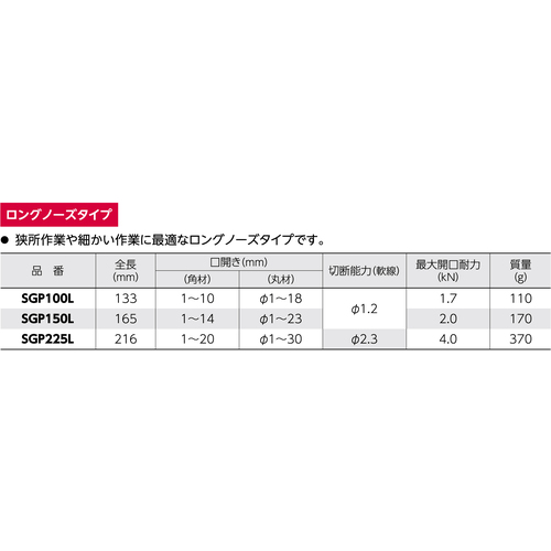 スーパー グリッププライヤ ロングノーズタイプ 全長:165mm 口開き:(角材)1~14、(丸材)φ1~23 SGP150L