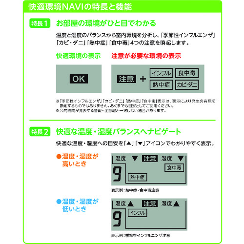 ●インフルエンザ、カビダニ、熱中症、食中毒の4つの注意を喚起し室内を快適な環境へナビゲートします。