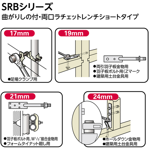 スーパー 曲がりしの付・両口ラチェットレンチ ショートタイプスライド穴付 呼び:17×21 全長:240mm SRB1721R