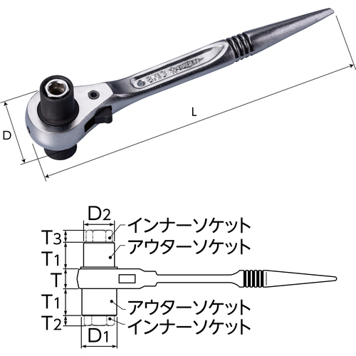●1丁で4サイズの六角対辺に対応した、シノ付ラチェットレンチです。