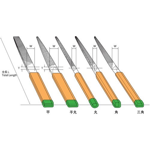 ●組ヤスリの5本組~12本組は全長を表します。5本組=215mm 8本組=200mm 10本組=185mm 12本組=170mm