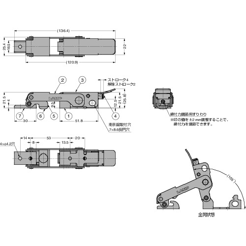 ●押込具が扉を押し込み、取付面に垂直方向の締付ができます。