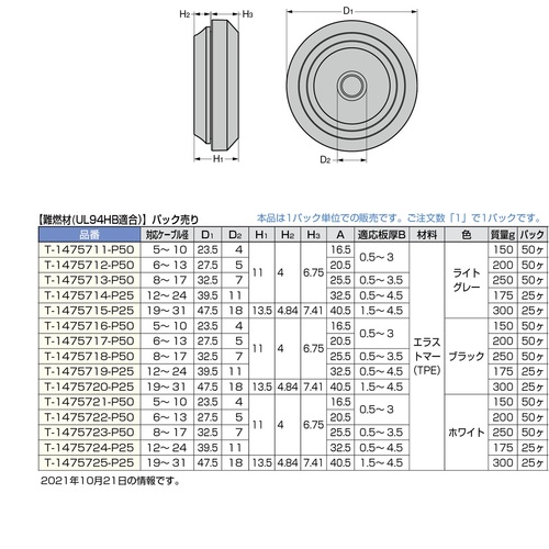 SUGATSUNE (210039203)T-1475723-P50 防水・防塵グロメット フレキシブルタイプ 難燃材UL94HB適合 T-1475723-P50