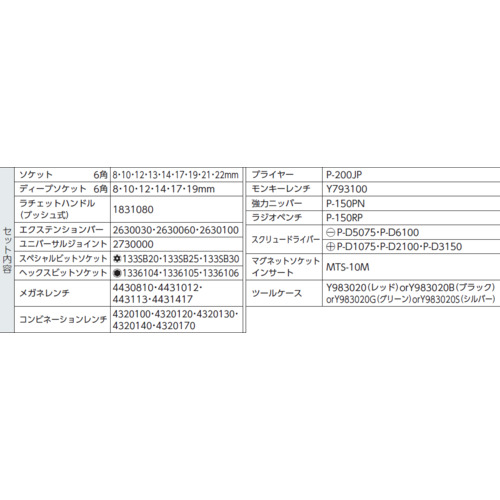 ●ディープソケットセット内容(mm):8・10・12・14・17・19、エクステンションバー(mm):75・150・250、ラチェットハンドル(mm):190、ユニバーサルジョイント、スペシャルビットソケット:T20・30・40●ヘックスビットソケット(mm):4・5・6、メガネレンチ(mm):8×10・10×12・11×13・14×17●コンビネーションレンチ(mm):8・10・12・13・14・17、プライヤー、モンキーレンチ、強力ニッパー、ラジオペンチ●スクリュードライバー:[[(-)]]5×75・[[(-)]]6×100、[[(+)]]No.1×75・No.2×100・No.3×150、ソケットハンガー、マグネットソケットインサート