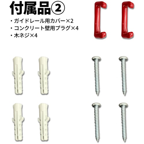●レール1m●ホルダー6個●木ねじ4個●コンクリート壁用プラグ4個●ガイドレール用カバーゴム2個●レール1m●ホルダー6個●木ねじ4個●コンクリート壁用プラグ4個●ガイドレール用カバーゴム2個