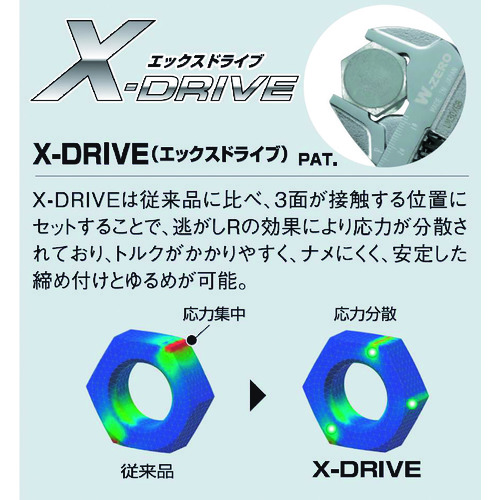 ●X-DRIVE(エックスドライブ)により、ボルト・ナットの角がなめにくく安定した締め付けと緩めが可能です。