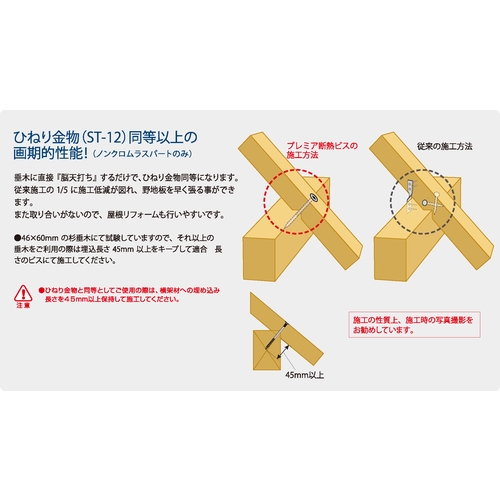 ●ひねり金物と同等としてご使用の際は、横架材への埋め込み長さを45mm以上保持して施工してください。