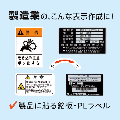 ●600dpiの高画質印刷で文字の細かい銘板やPLラベルの作成に適しています。