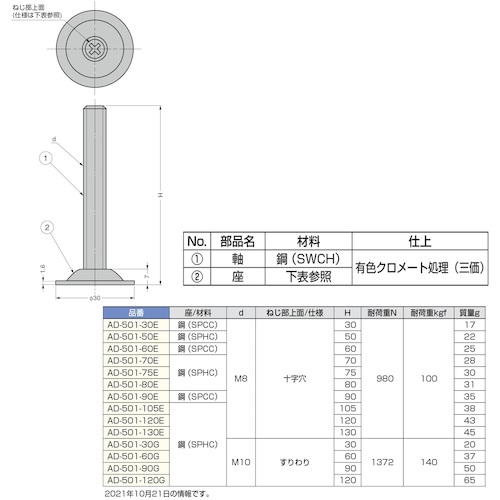 ●ねじ部上面の十字穴(M8仕様)を使って、ドライバーで高さ調整が可能です。