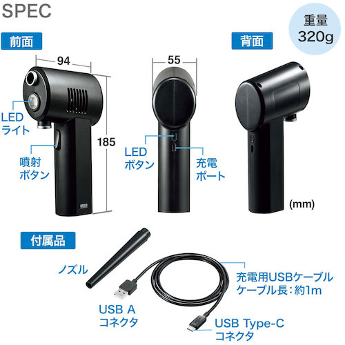 ●通常のエアダスターに比べ、繰り返しの購入がなく、空き缶の処理、ガスの匂い、火気による危険がありません。