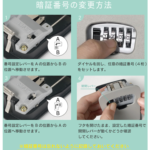 ●鍵の暗証番号は可変式で4桁の番号を自由に設定できます。