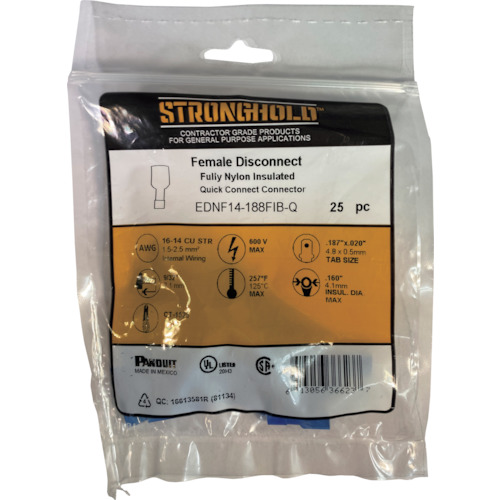 ストロングホールド ナイロン完全絶縁被覆付圧着端子 メス型 電線サイズ:AWG16~14/1.25~2sq 188タブ用 25個入り EDNF14-188FIB-Q EDNF14-188FIB-Q