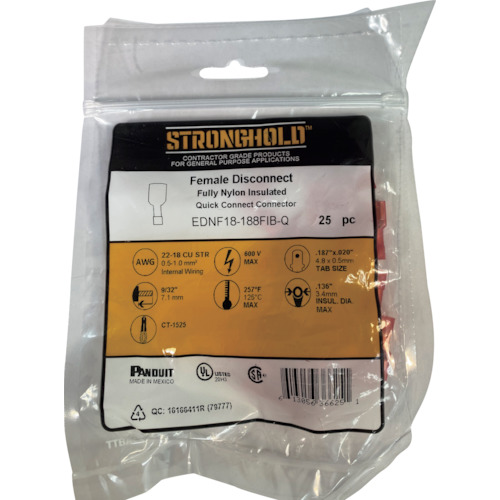 ストロングホールド ナイロン完全絶縁被覆付圧着端子 メス型 電線サイズ:AWG22~18/0.3~0.75sq 188タブ用 25個入り EDNF18-188FIB-Q EDNF18-188FIB-Q