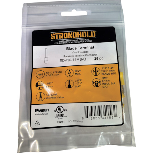 ストロングホールド ビニール絶縁被覆付ブレード端子 電線サイズ:AWG12~10/3.5~5.5sq 25個入り EDV10-11MB-Q EDV10-11MB-Q