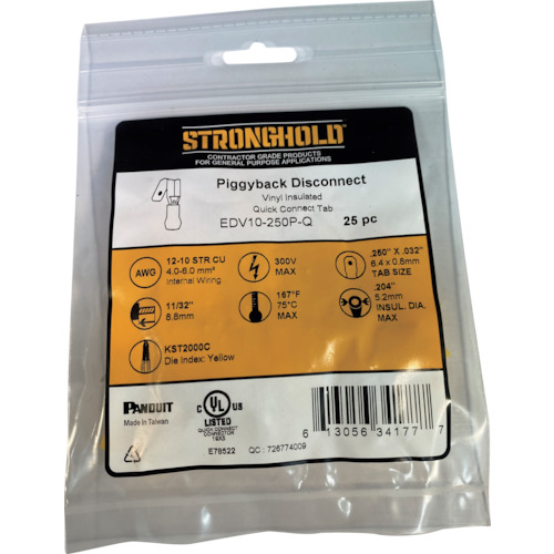 ストロングホールド Piggy Back ビニール絶縁被覆付圧着端子 電線サイズ:AWG12~10/3.5~5.5sq 250タブ用 25個入り EDV10-250P-Q EDV10-250P-Q