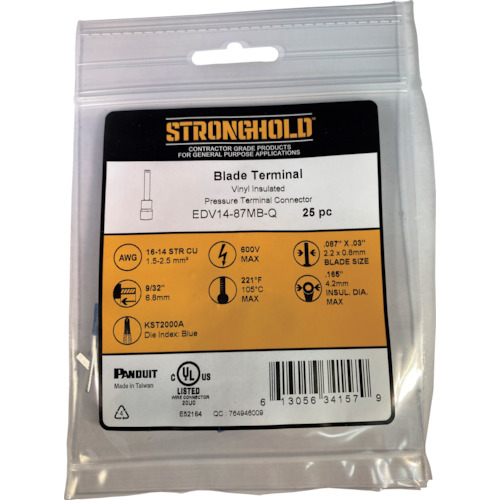 9. ストロングホールド ビニール絶縁被覆付ブレード端子 電線サイズ:AWG16~14/1.25~2sq 25個入り EDV14-87MB-Q EDV14-87MB-Q