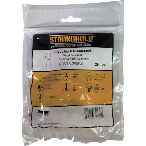 ストロングホールド Piggy Back ビニール絶縁被覆付圧着端子 電線サイズ:AWG22~18/0.3~0.75sq 250タブ用 25個入り EDV18-250P-Q EDV18-250P-Q