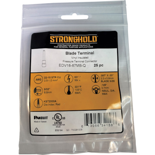 ストロングホールド ビニール絶縁被覆付ブレード端子 電線サイズ:AWG22~18/0.3~0.75sq 25個入り EDV18-87MB-Q EDV18-87MB-Q