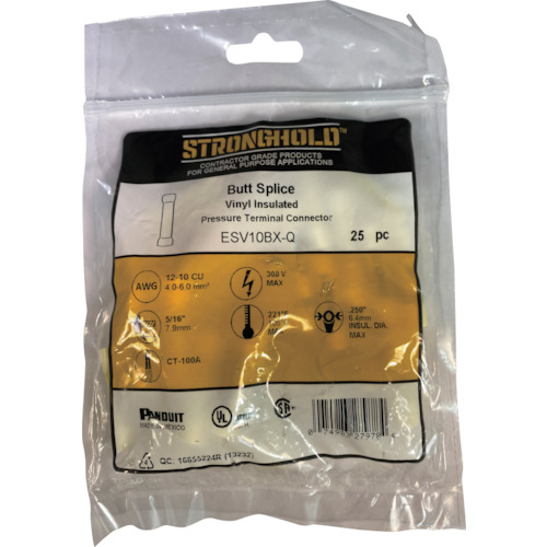 ストロングホールド ビニール絶縁被覆付圧着スリーブ(突き合わせ用) 電線サイズ:AWG12~10/3.5~5.5sq 25個入り ESV10BX-Q ESV10BX-Q