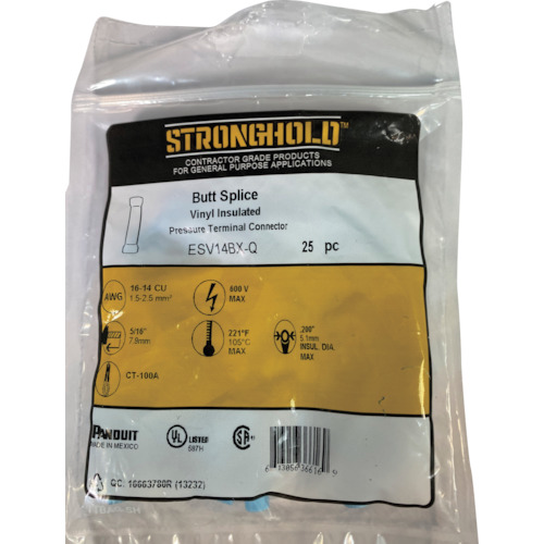 ストロングホールド ビニール絶縁被覆付圧着スリーブ(突き合わせ用) 電線サイズ:AWG16~14/1.25~2sq 25個入り ESV14BX-Q ESV14BX-Q
