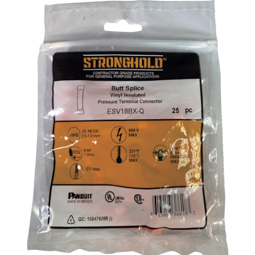 ストロングホールド ビニール絶縁被覆付圧着スリーブ(突き合わせ用) 電線サイズ:AWG22~18/0.3~0.75sq 25個入り ESV18BX-Q ESV18BX-Q
